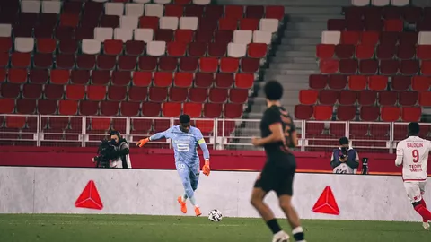 Brice Samba évite le pire face à la frappe plein axe de Mika Biereth. Gros réflexe de notre gardien.